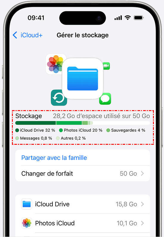Outre iCloud Drive, d'autres services utilisent également le stockage iCloud, notamment iCloud Photos, iCloud Backup, Messages, Mail et les mémos vocaux. Ainsi, vous pouvez libérer de l'espace de stockage iCloud en libérant des fichiers dans ces services.