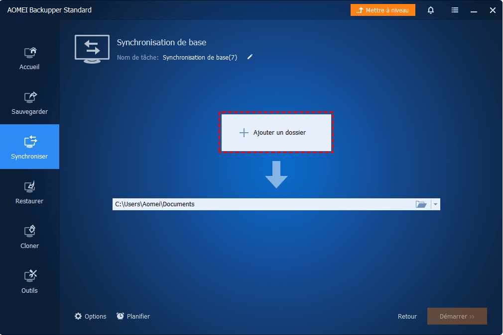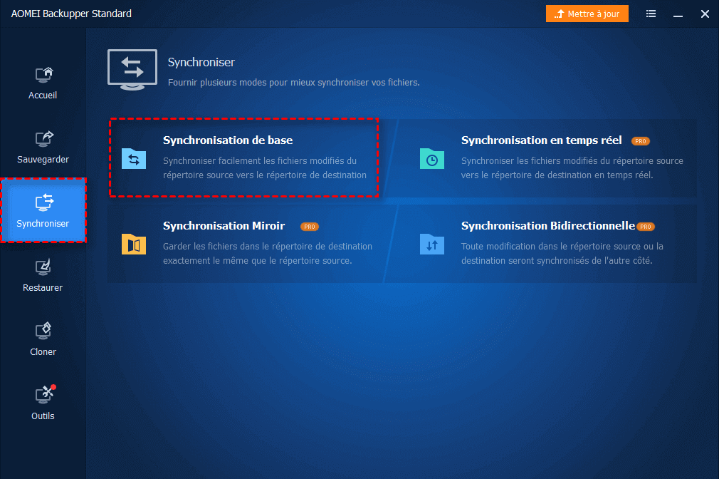 Étape 1. Installez et lancez AOMEI Backupper. Cliquez sur l'onglet « Synchroniser », puis sur « Synchronisation de base ».