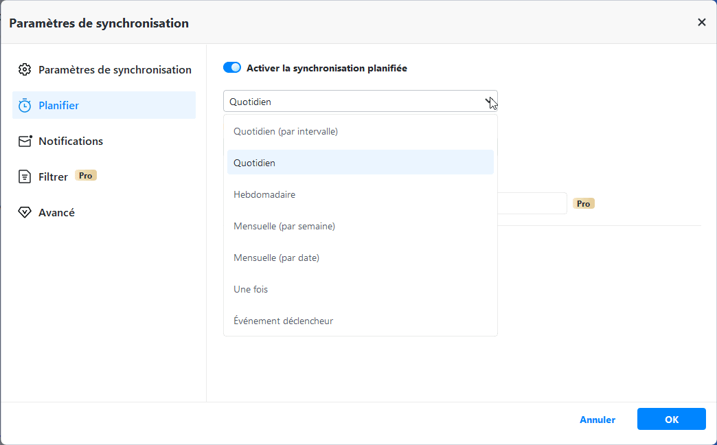 Pour configurer la synchronisation automatique des fichiers, cliquez sur « Planifier la synchronisation ». Vous pouvez alors choisir de synchroniser vos fichiers Google Drive quotidiennement, hebdomadairement ou mensuellement.