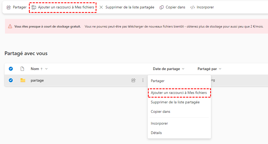 Cependant, dans certains cas, l'option « Ajouter un raccourci à Mes fichiers » n'est pas disponible :