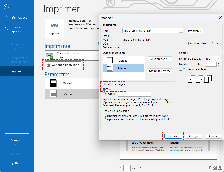 - Si vous ne parvenez pas à prévisualiser toutes les pages de l'e-mail, vous pouvez sélectionner « Imprimer toutes les pages » à l'étape 3, même si elles ne s'affichent pas, et les enregistrer au format PDF dans le dossier Téléchargements. Ensuite, relancez l'impression : toutes les pages seront alors sélectionnées, affichées et imprimées.