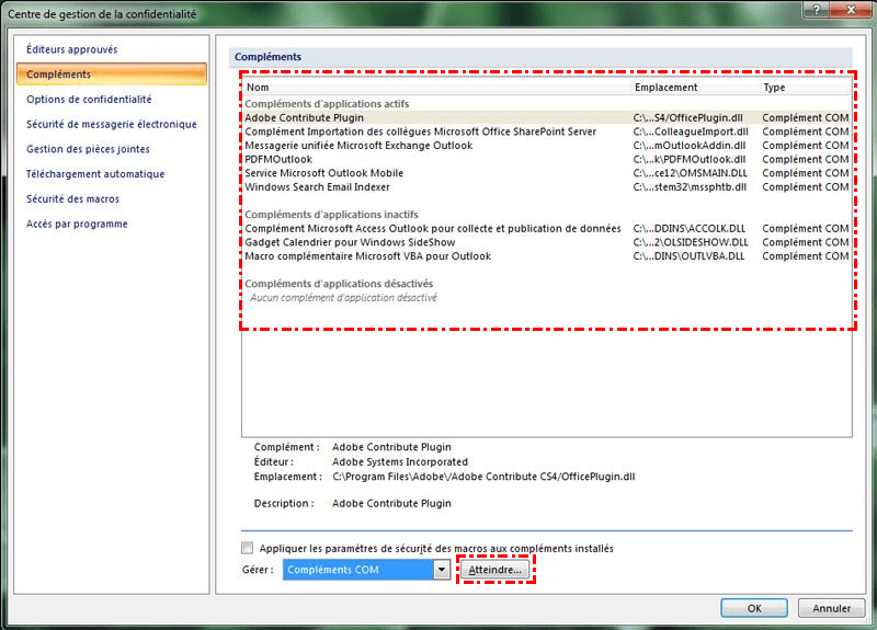 Vous pouvez rechercher les compléments actifs en les désactivant individuellement et en redémarrant l'application Outlook. Identifiez le complément dont la désactivation résout le problème d'impression dans Outlook.