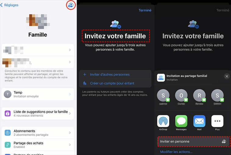 S'ils n'ont pas été ajoutés à votre forfait iCloud+, cliquez sur Famille > Invitez votre famille > Inviter d'autres personnes > Inviter en personne pour les inviter à nouveau. Ils recevront alors un message leur demandant de vérifier et d'accepter l'invitation à rejoindre le partage familial.