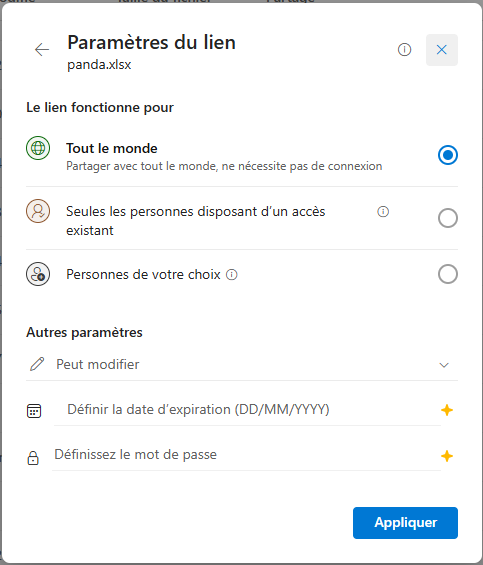 Conseil : Si vous êtes abonné à OneDrive, vous pouvez sélectionner « Tout le monde » dans les paramètres du lien afin de définir une date d'expiration et des mots de passe pour mieux protéger vos fichiers partagés et vos comptes.