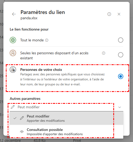 - Uniquement pour les utilisateurs de OneDrive Entreprise : Le lien est accessible à tous les utilisateurs travaillant dans votre organisation. Cependant, il n'est pas possible de choisir une date d'expiration ni un mot de passe.