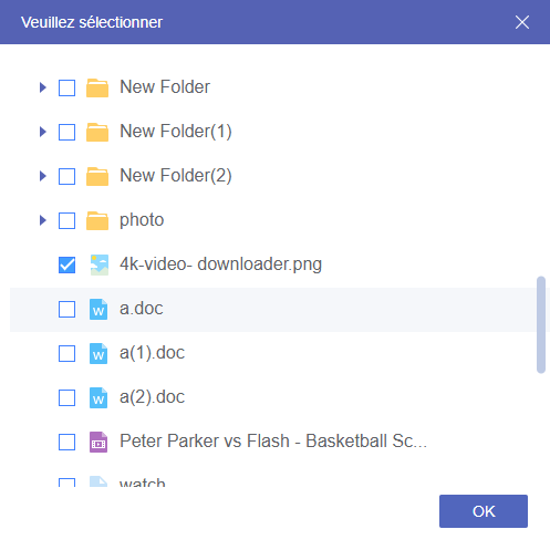 Étape 4 : Cochez les cases devant les photos ou dossiers cibles dans la fenêtre « Veuillez sélectionner ». Cliquez ensuite sur « OK ».