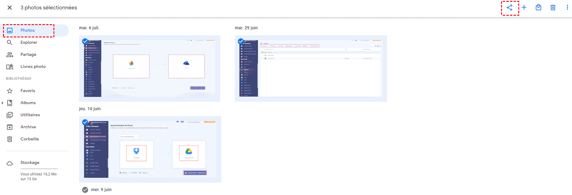 Étape 2. Cliquez sur « Photos », sélectionnez les photos à partager, puis cliquez sur l'icône « Partager ».