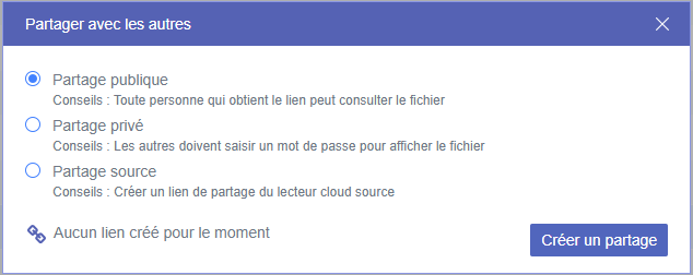 - Partage Intelligent : Partager des fichiers cloud en mode public, privé ou source.