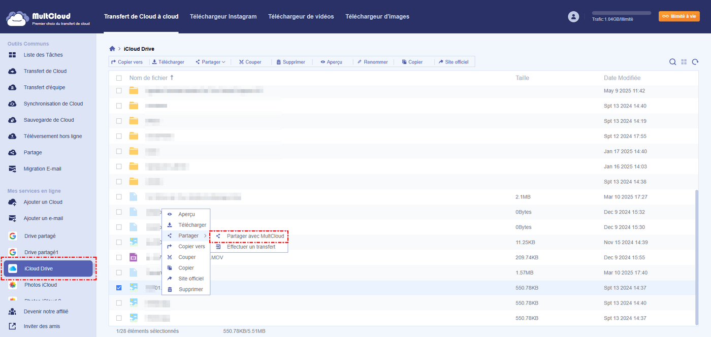 MultCloud regroupe plusieurs services de stockage cloud tels que iCloud Drive, iCloud Photos, Google Drive et Dropbox sur un seul site web. Après avoir ajouté votre compte iCloud Drive à MultCloud, vous pouvez gérer les fichiers iCloud Drive à l'aide de ses fonctions, telles que Télécharger, Renommer, Supprimer, Couper, Copier et Partager. Grâce à la fonction Partager, vous pouvez partager des fichiers et des dossiers sur n'importe quel cloud à l'aide d'un lien MultCloud qui peut être ouvert et consulté par n'importe quel utilisateur sans compte. Lorsque les destinataires reçoivent le lien partagé, ils peuvent télécharger directement les fichiers à partir de ce lien.