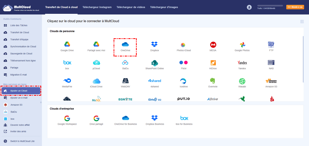 Étape 2. Cliquez sur l'onglet « Ajouter un Cloud » dans la barre de navigation de gauche, puis cliquez sur son icône et suivez les instructions de la fenêtre suivante pour ajouter OneDrive.