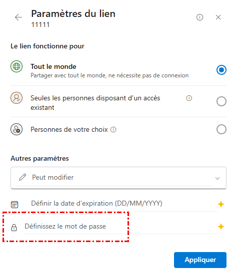 Pour mettre un mot de passe sur un dossier OneDrive ou un fichier partagé, activez l'option « Définir un mot de passe ». Entrez un mot de passe fort que vous communiquerez séparément aux destinataires concernés. Veillez à utiliser une combinaison de lettres majuscules et minuscules, de chiffres et de symboles pour créer un mot de passe robuste.