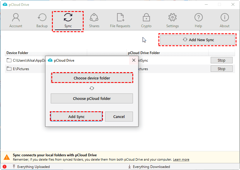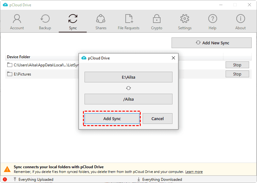2. Cliquez ensuite sur « Ajouter une synchronisation » pour synchroniser directement un dossier avec pCloud.