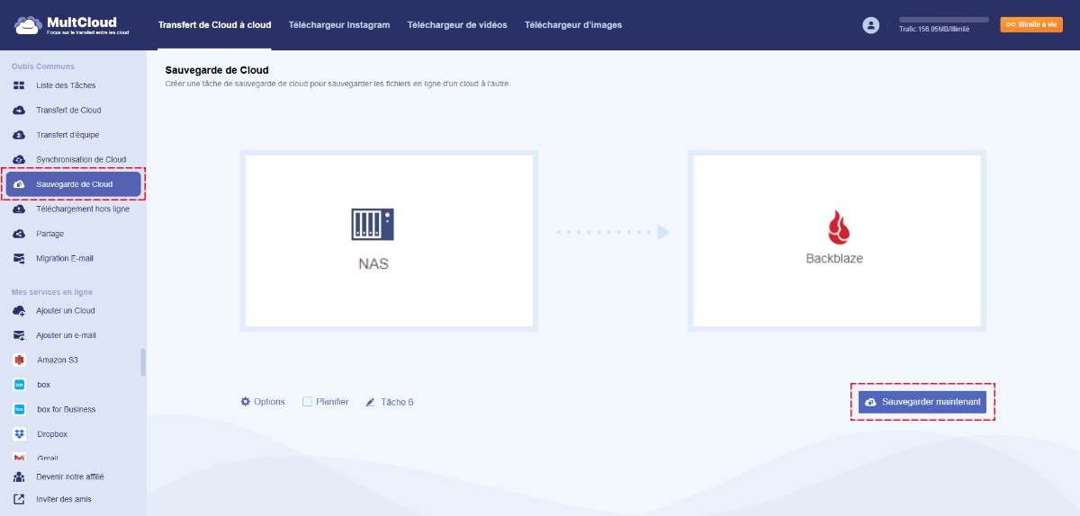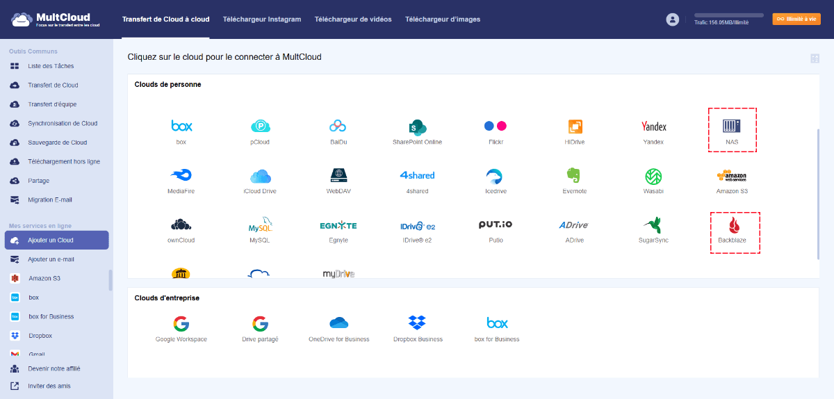 Alors, comment sauvegarder un NAS Synology sur le cloud avec MultCloud ? Prenons l'exemple de la sauvegarde d'un NAS sur Backblaze.
