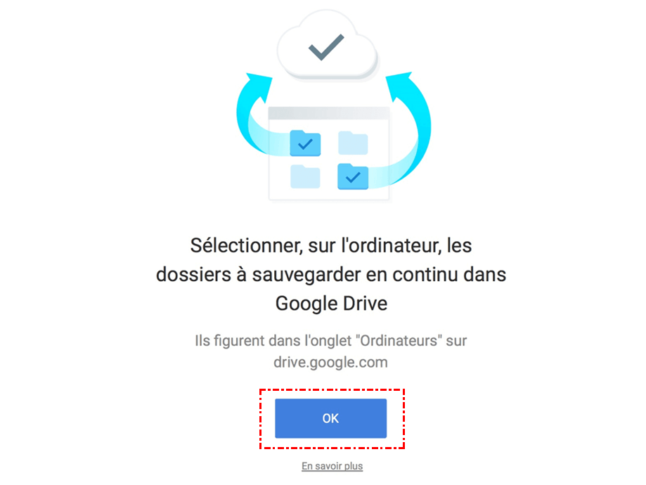 Étape 4. Une fois connecté, un écran vous présentera son service de base : la sauvegarde continue des dossiers de l'ordinateur vers l'onglet « Ordinateurs » de Google Drive.