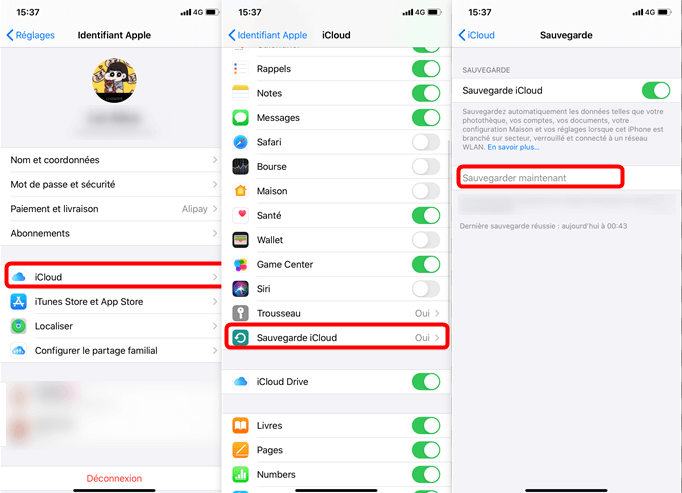 Étape 1 : Activez la sauvegarde iCloud sur votre iPhone pour transférer automatiquement vos photos locales vers Photos iCloud. Accédez à Réglages > Apple ID > iCloud > Sauvegarde > Activer Sauvegarde iCloud. Les photos locales de votre iPhone seront alors automatiquement enregistrées dans Photos iCloud.