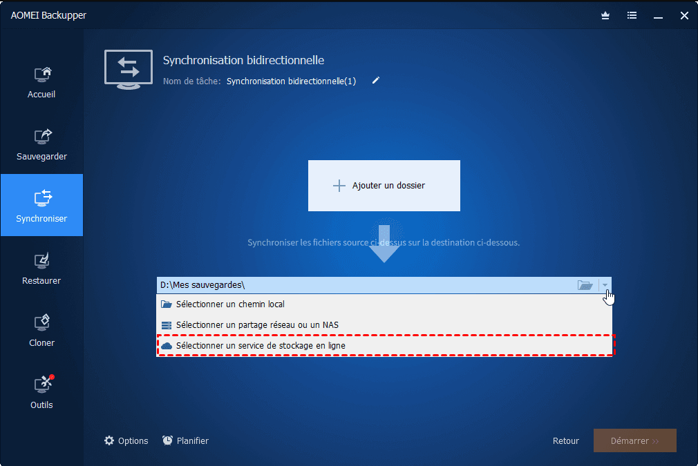 Étape 3 : Appuyez sur la flèche vers le bas et choisissez « Sélectionner un service de stockage en ligne » pour choisir un dossier OneDrive. Ensuite, cliquez sur « Démarrer la synchronisation » pour lancer la tâche.