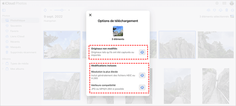 4. Choisissez Originaux non modifiés ou Modifications incluses, puis cliquez sur Télécharger pour restaurer les photos et vidéos de votre Mac.