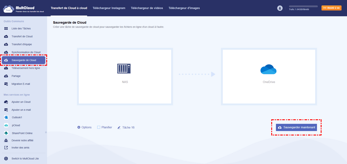 Étape 3 : Passez maintenant à « Sauvegarde de Cloud » dans la barre latérale gauche. Sélectionnez le NAS Synology comme répertoire source et OneDrive comme répertoire cible. Enfin, vous pouvez cliquer sur l'onglet « Sauvegarder maintenant ».