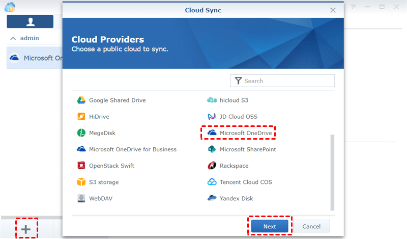 Étape 2 : Cliquez sur l'icône « + » dans le coin gauche, puis sur l'icône Microsoft OneDrive pour autoriser l'accès au NAS Synology.
