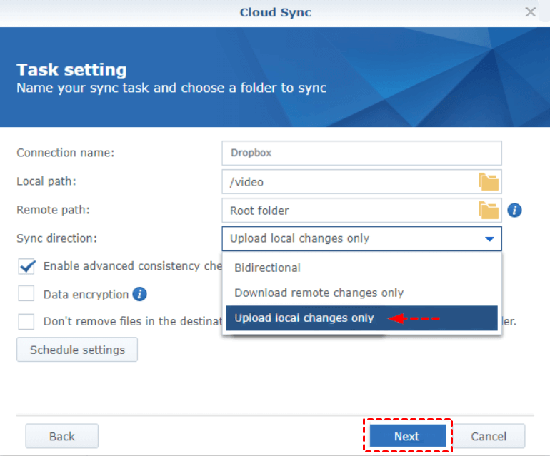 - Sens de la synchronisation : Vous souhaitez sauvegarder uniquement les fichiers de votre NAS Synology vers OneDrive, sélectionnez « Charger uniquement les modifications locales ».