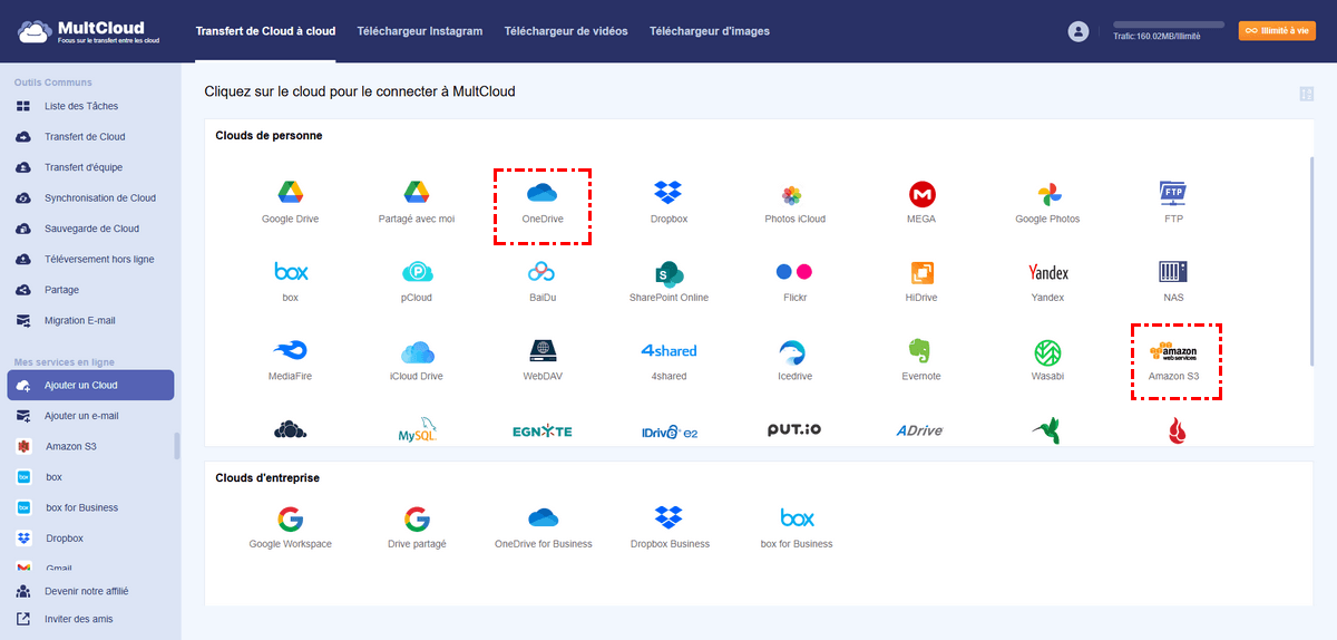 Pour sauvegarder OneDrive sur S3, MultCloud vous permet d'effectuer rapidement des sauvegardes. Vous pouvez également l'utiliser pour gérer plusieurs comptes de stockage cloud, transférer ou synchroniser vos données entre plusieurs clouds.