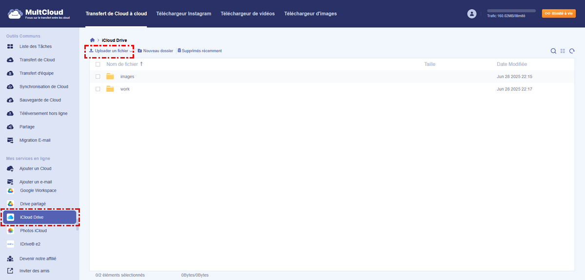 Étape 3 : Une fois le cloud ajouté, il s'affiche dans la barre d'outils de gauche. Pour gérer vos fichiers, cliquez dessus et effectuez les opérations souhaitées. Accédez à iCloud Drive, puis glissez-déposez les données à sauvegarder sur votre ordinateur. Vous pouvez également cliquer sur le bouton « Uploader un fichier » pour sélectionner les données à sauvegarder.