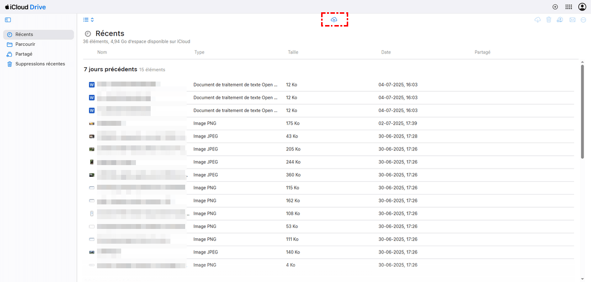Étape 3 : Cliquez sur l'icône de chargement en haut du ruban. Sélectionnez ensuite les fichiers ou dossiers à sauvegarder. Vous pouvez également glisser-déposer ces fichiers directement sur l'interface iCloud.