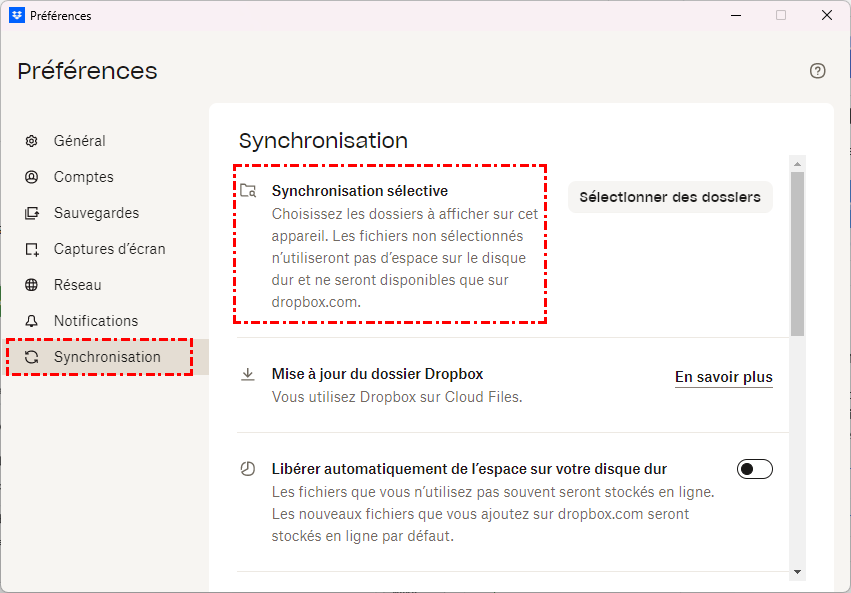 Ensuite, dans la fenêtre Préférences Dropbox, accédez à l'onglet Synchronisation et sélectionnez « Synchronisation sélective ».