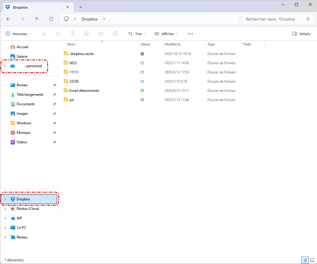 Étape 2. Après l'installation et la configuration, Dropbox et OneDrive créeront un dossier de synchronisation dans votre Explorateur de fichiers Windows. Vous pouvez ensuite migrer Dropbox vers OneDrive en glissant-déposant des fichiers ou dossiers Dropbox sur OneDrive.