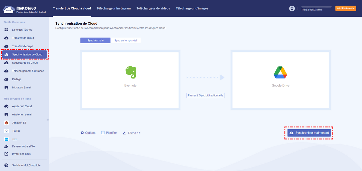 À la place, vous pouvez utiliser un gestionnaire de fichiers cloud tiers professionnel nommé MultCloud pour réaliser une intégration automatique entre Evernote et Google Drive sans téléchargement ni upload.