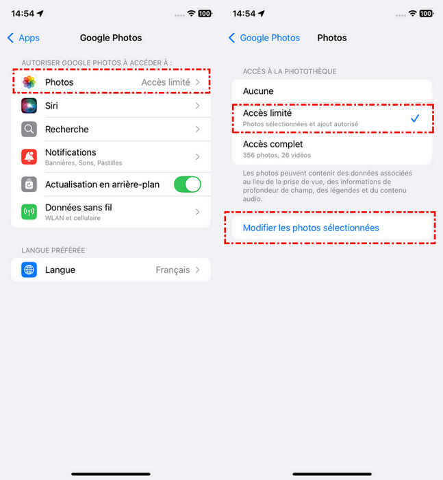 R2 : Pour importer uniquement les photos sélectionnées, vous devez configurer les paramètres de votre iPhone. Accédez à Réglages > Google Photos > Photos. Cliquez sur le bouton « Accès limité » et cliquez sur « Modifier les photos sélectionnées ». Sélectionnez ensuite les photos à importer dans Google Photos et cliquez sur « Terminé ».