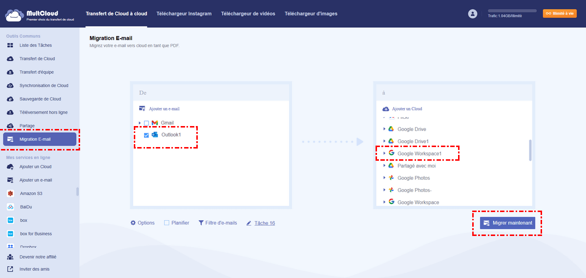 Sauvegarder les e-mails Outlook vers Google Workspace avec MultCloud