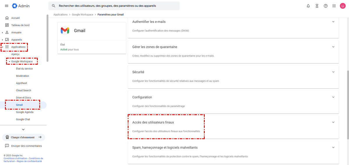 1. Connectez-vous à votre console d'administration Google Workspace, cliquez sur Applications dans le menu de gauche, puis sur Google Workspace > Gmail > Accès des utilisateurs finaux.