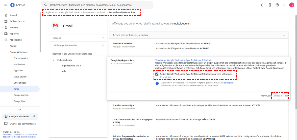 2. Configurez ensuite Google Workspace Sync et activez l'option « Activer Google Workspace Sync for Microsoft Outlook pour mes utilisateurs ».