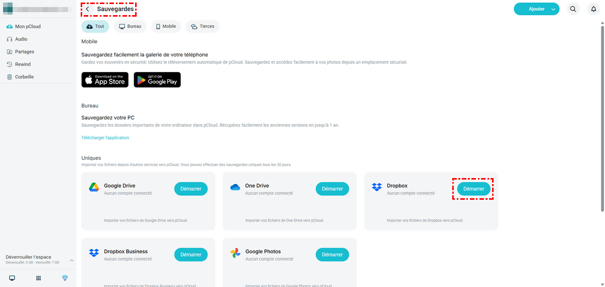 (Remarque : Importez vos fichiers d'autres services vers pCloud. Vous pouvez effectuer des sauvegardes ponctuelles une fois tous les 30 jours.)