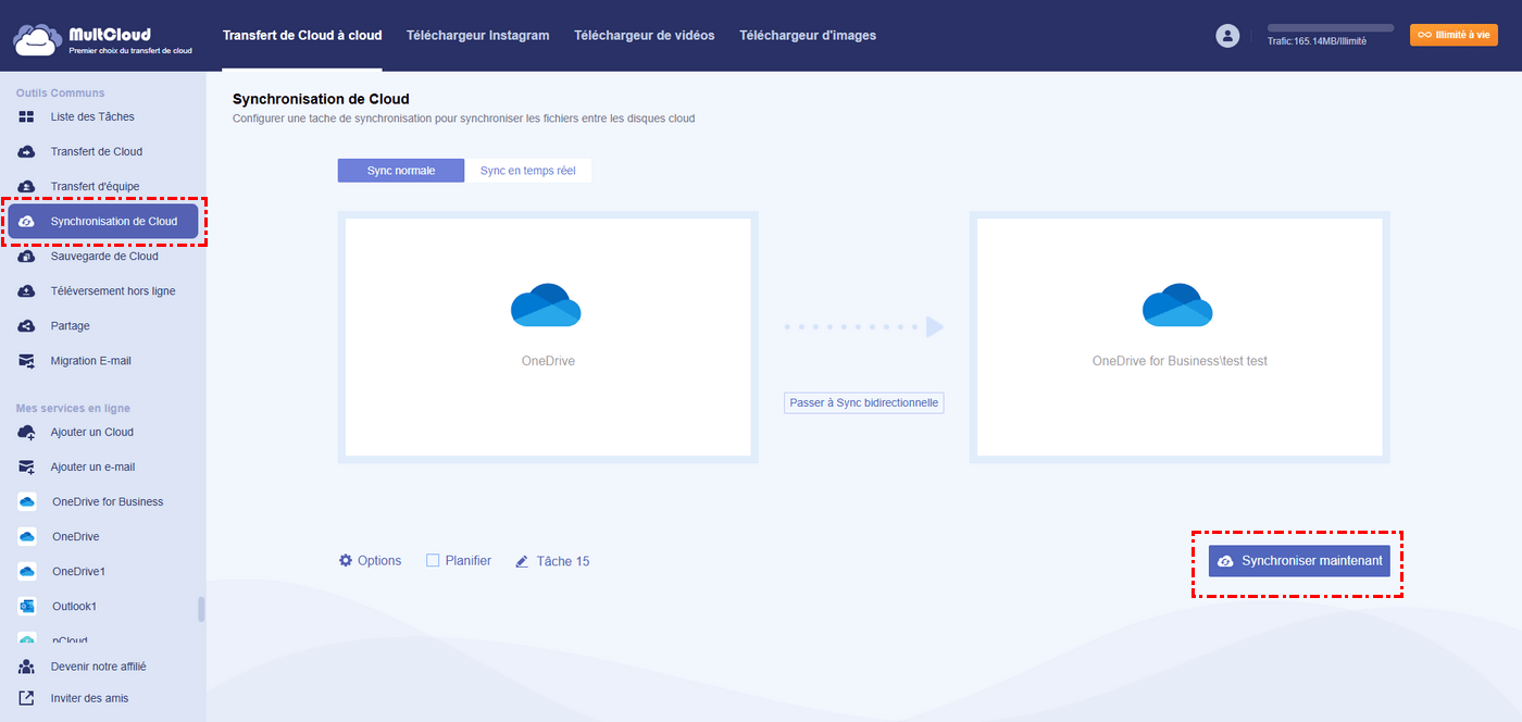 Comme vous pouvez le voir, il est très facile de synchroniser plusieurs comptes OneDrive à l’aide de MultCloud. En plus de « Synchronisation de Cloud », MultCloud a également « Transfert de Cloud » et « Mon Cloud ».