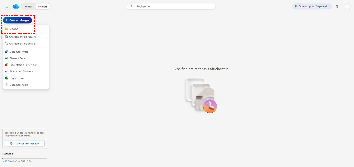 Étape 2. Créez un nouveau dossier dans votre compte. Cliquez sur « Créer ou charger » en haut à gauche de la page, puis sur « Dossier » dans le menu déroulant pour créer un dossier et le renommer.