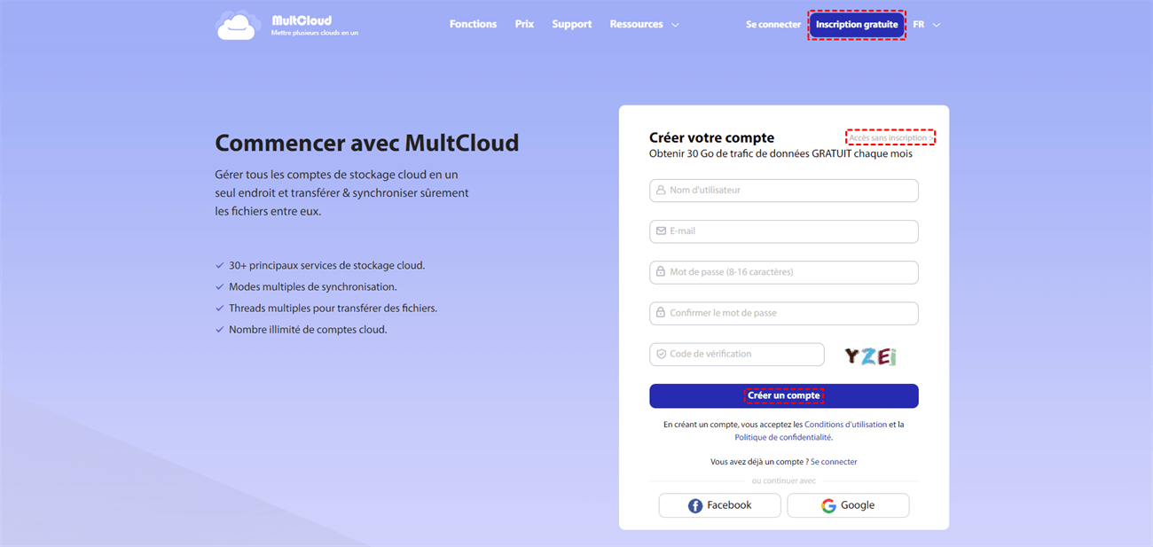 Étape 1. Inscrivez-vous. Visitez MultCloud et créez un compte gratuit. Vous devez entrer votre adresse e-mail, votre nom d'utilisateur et votre mot de passe préférés. Cliquez ensuite sur « Créer un compte ».