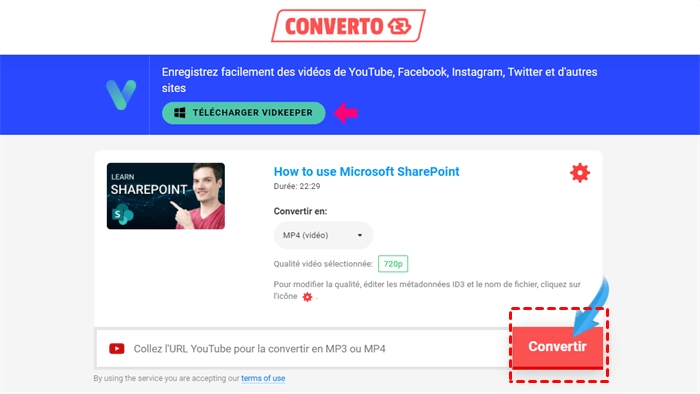 Il existe un site appelé Converto.io. Insérez simplement l'URL de votre vidéo source sur le site et cliquez sur le bouton « Convertir », la vidéo sera bientôt stockée sur vos appareils.