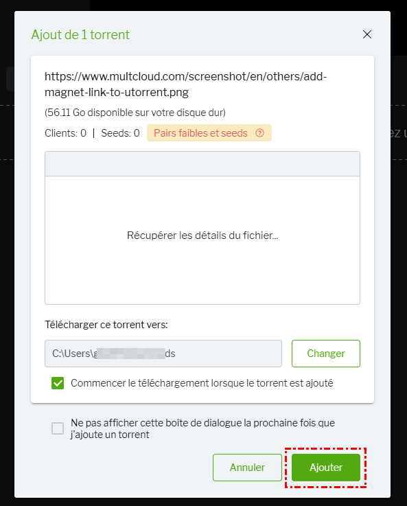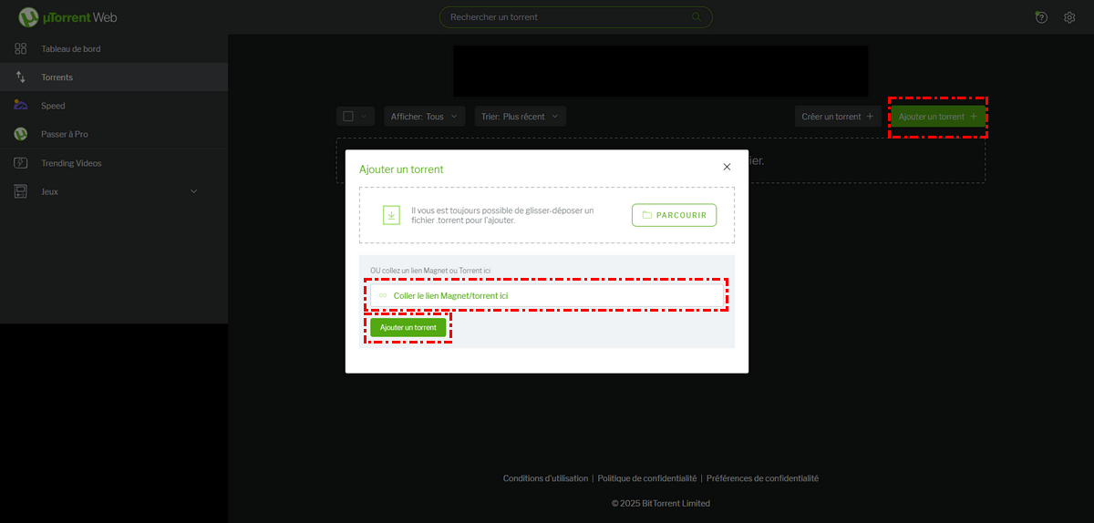 Étape 2 : Copiez et collez le lien magnet dans la fenêtre contextuelle pour l'ajouter à uTorrent. Cliquez ensuite sur « Ajouter un Torrent ».
