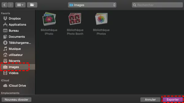 Étape 3. Après avoir défini les paramètres d'exportation, sélectionnez le dossier dans lequel vous souhaitez exporter les photos, par exemple Images. Cliquez ensuite sur Exporter. Les photos seront téléchargées dans le dossier que vous avez sélectionné sur votre Mac.