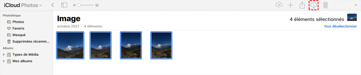 Étape 3. Vous pouvez maintenant voir toutes les photos dans le navigateur. Sélectionnez chaque photo et appuyez sur l'icône de cloud dans le coin supérieur droit pour télécharger les images une par une depuis le compte iCloud vers l'ordinateur.