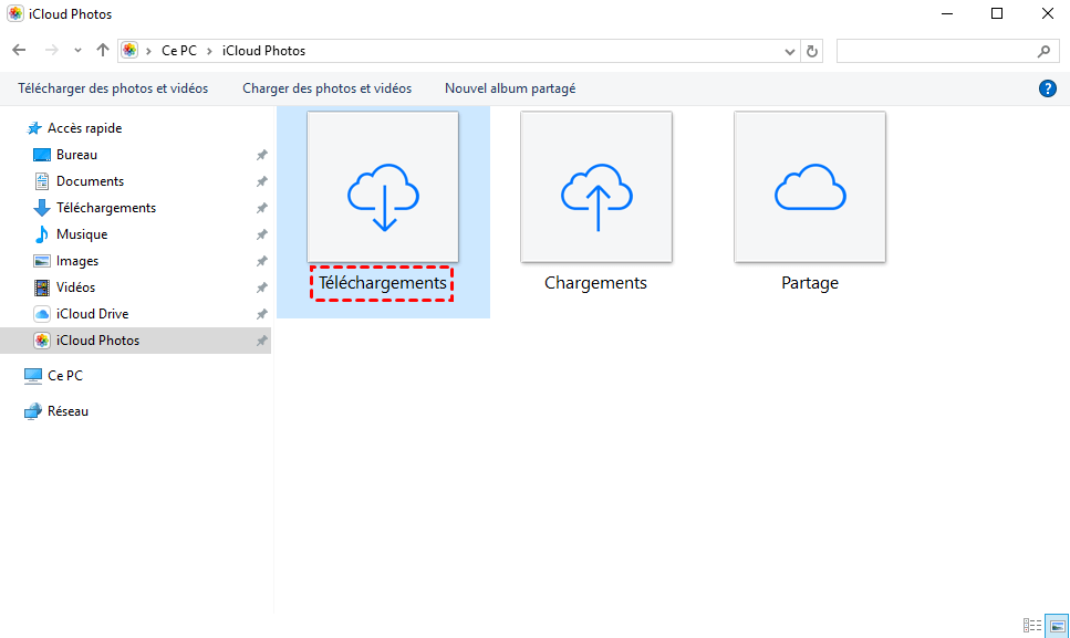 Étape 4. Pour trouver vos photos iCloud sur votre ordinateur, allez dans Explorateur de fichiers > Photos iCloud. Les photos de votre iPhone apparaîtront dans votre dossier Téléchargements.
