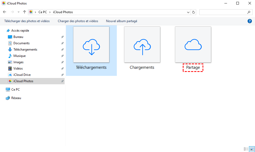Étape 3. Pour trouver les albums partagés iCloud sur votre ordinateur, allez dans l'Explorateur de fichiers > Photos iCloud. Les photos partagées apparaissent dans le dossier Partagé. À partir de là, vous pouvez copier les photos partagées dans n'importe quel dossier de votre ordinateur.