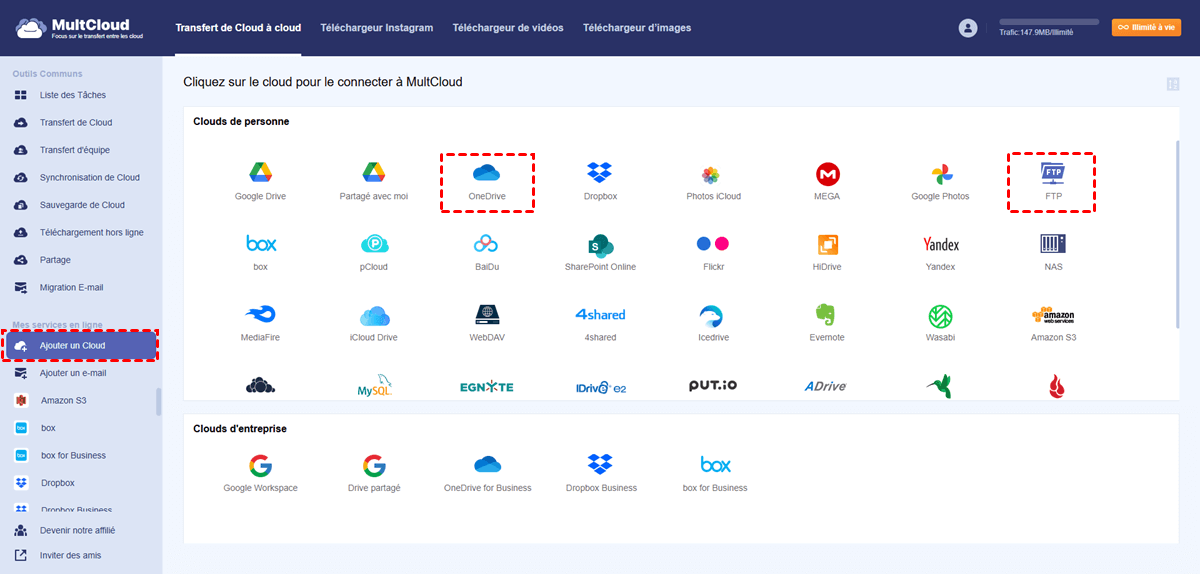 Cliquez sur « Ajouter un Cloud » et ajoutez vos comptes FTP et OneDrive un par un à MultCloud.