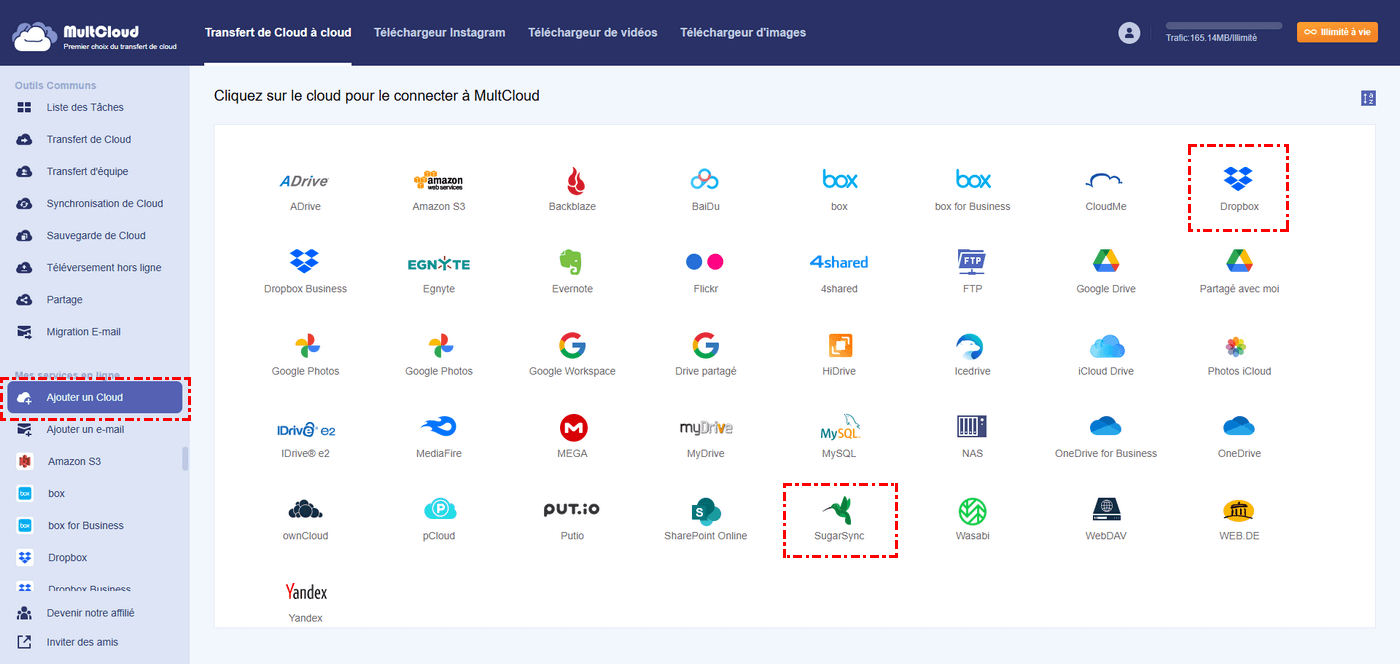 Avant d'utiliser MultCloud pour transférer des données, vous devez ajouter SugarSync et Dropbox à MultCloud.