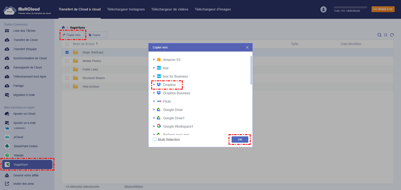 Pour transférer des fichiers ou des dossiers de SugarSync vers Dropbox plus rapidement et plus facilement, vous pouvez essayer MultCloud, le gestionnaire de fichiers cloud. Cette application web vous permet de gérer simultanément plusieurs comptes de stockage cloud et de transférer, synchroniser et sauvegarder des données entre eux.