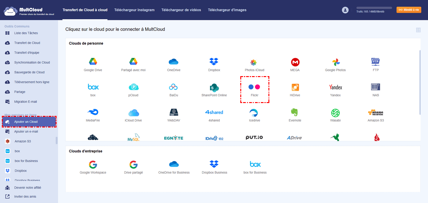 2. Cliquez sur le bouton « Ajouter un Cloud » et sélectionnez Flickr.