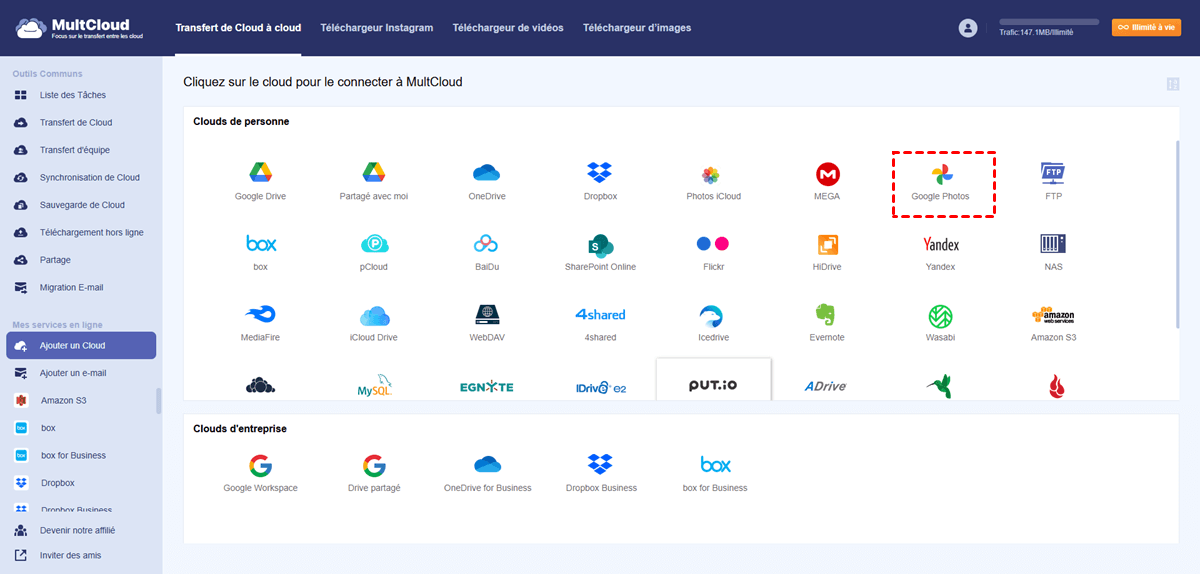 Dans cette partie, vous découvrirez des méthodes simples pour transférer rapidement des photos Flickr vers Google Photos avec MultCloud, et choisirez celle qui vous convient le mieux. Tout d'abord, ajoutez Flickr et Google Photos à votre compte ; les deux clouds sont visibles dans l'interface de MultCloud. Pour migrer plus rapidement vos photos entre Flickr et Google Photos, vous pouvez utiliser différentes méthodes selon les situations grâce à MultCloud. Vous pouvez maintenant transférer vos photos Flickr vers Google Photos de deux manières :