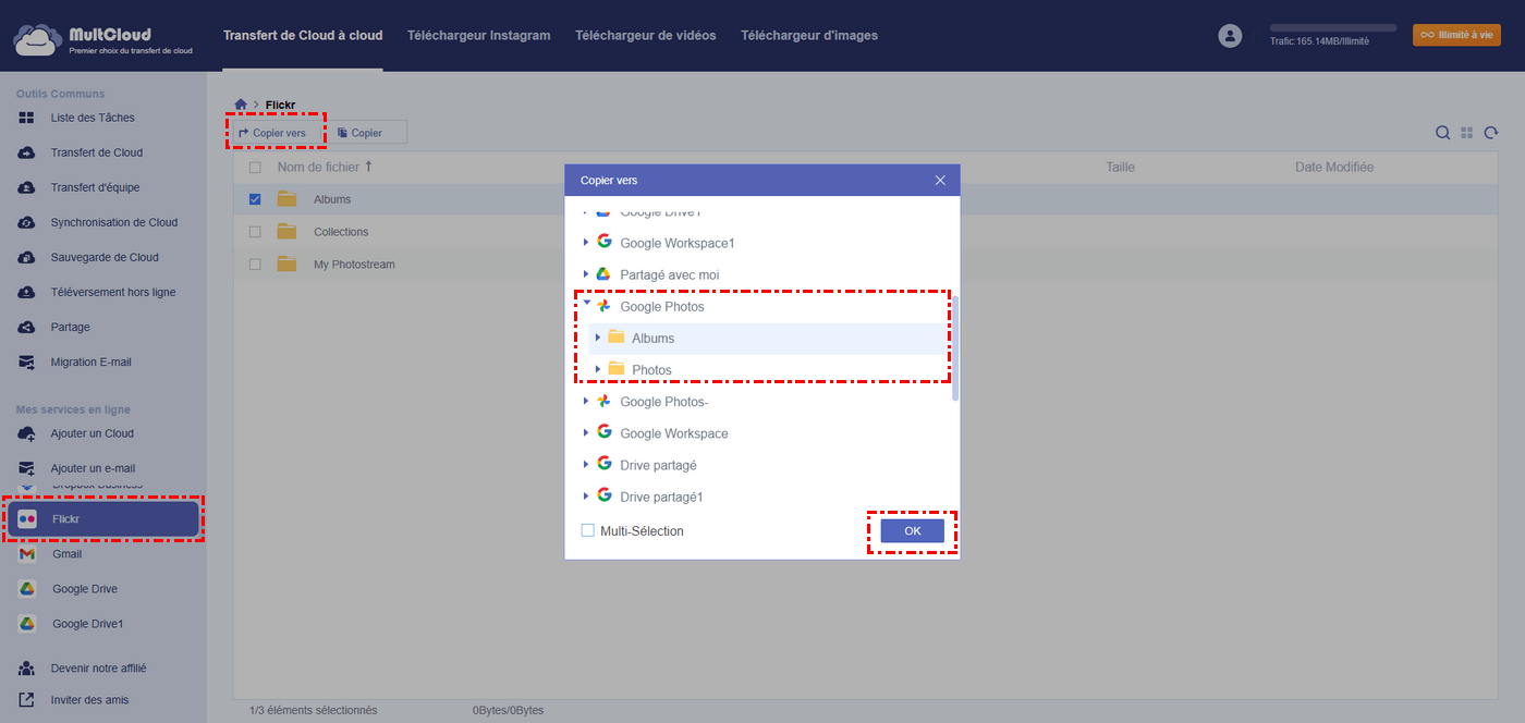 - Vous pouvez utiliser l'option Multi-Sélection pour copier simultanément des photos de Flickr vers OneDrive, Google Drive et d'autres clouds de votre choix, tout en les transférant de Flickr vers Google Photos.